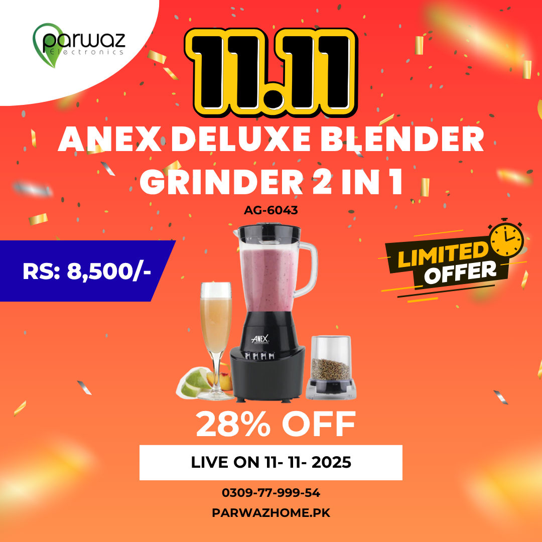 The Anex AG-6043 Deluxe Blender Grinder 2 in 1 is a powerful and efficient kitchen companion designed for effortless blending and grinding. Featuring sharp stainless steel blades, durable jars, and a strong motor, it easily handles fruits, vegetables, and spices. Perfect for smoothies, shakes, and fine grinding, this appliance combines performance with modern style for everyday use.