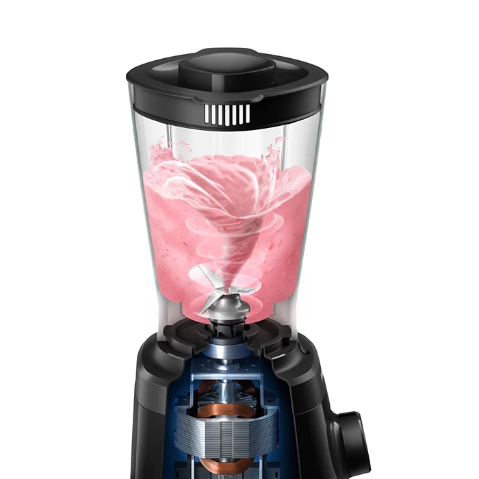 The Philips Daily Collection Blender HR2141/92 is built for everyday blending, from smoothies and purees to ice-crushing and dressings. Its 550 W motor delivers strong performance while maintaining energy efficiency. The 2.0 L plastic jar gives you ample capacity for family servings, while the ProBlend blade system ensures consistent mixing and smooth results even with tougher ingredients. You have 2 speed settings plus a pulse function to control texture. For ease of use, it includes non-slip feet for stability, a wide XL pouring spout to reduce spills, and many parts are dishwasher-safe (except the motor unit and blade assembly).
