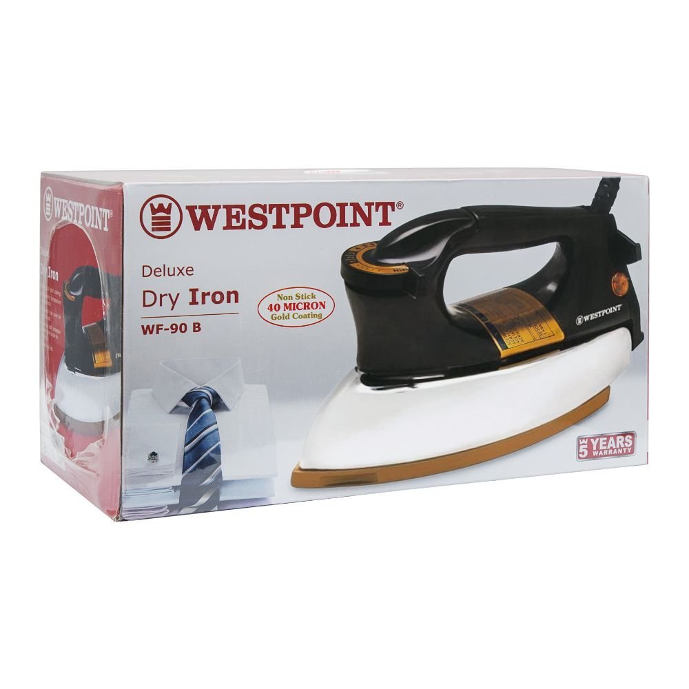 The Westpoint WF-90B Dry Iron is a reliable and efficient ironing solution designed for everyday use. Featuring a non-stick gold coating soleplate, it glides effortlessly over all types of fabrics, removing wrinkles with ease. The adjustable temperature control knob allows precise heat settings for different materials, while the extended rear cover provides convenient cord storage. With built-in overheat safety protection, a stable heel rest, and a comfortable handle for easy grip, this 1000W dry iron ensures safe, smooth, and hassle-free ironing every time.